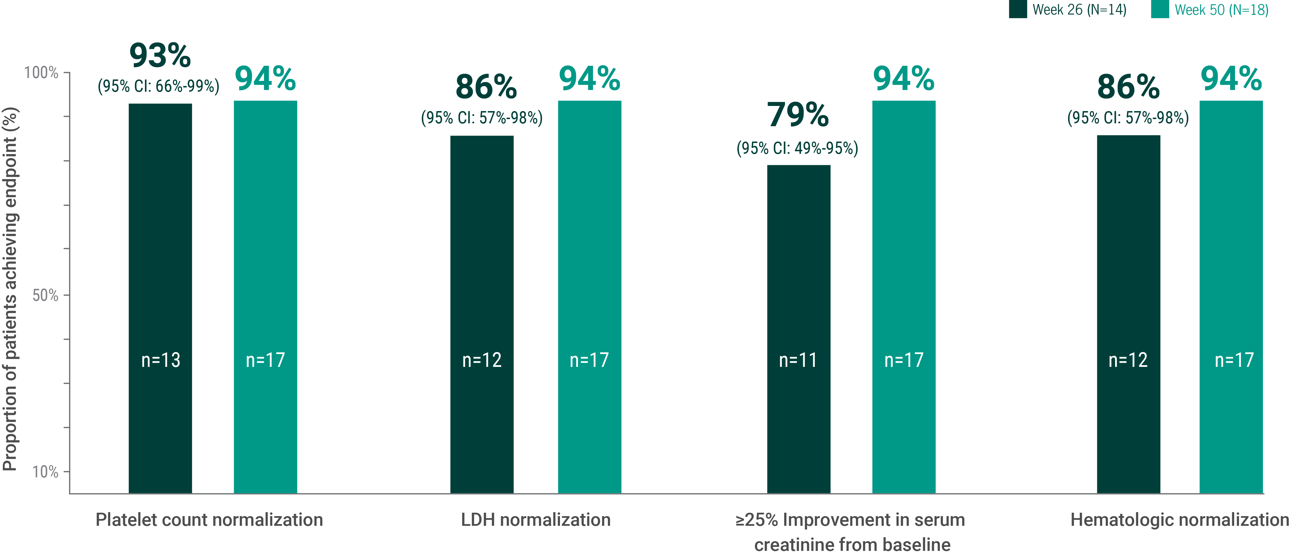 bComplete TMA response was defined as normalization of hematological parameters (platelet count and LDH) and ≥25% improvement in serum creatinine from baseline during the 26-week initial evaluation period. Patients had to meet all criteria at 2 separate assessments obtained at least 4 weeks (28 days) apart and any measurement in between.1