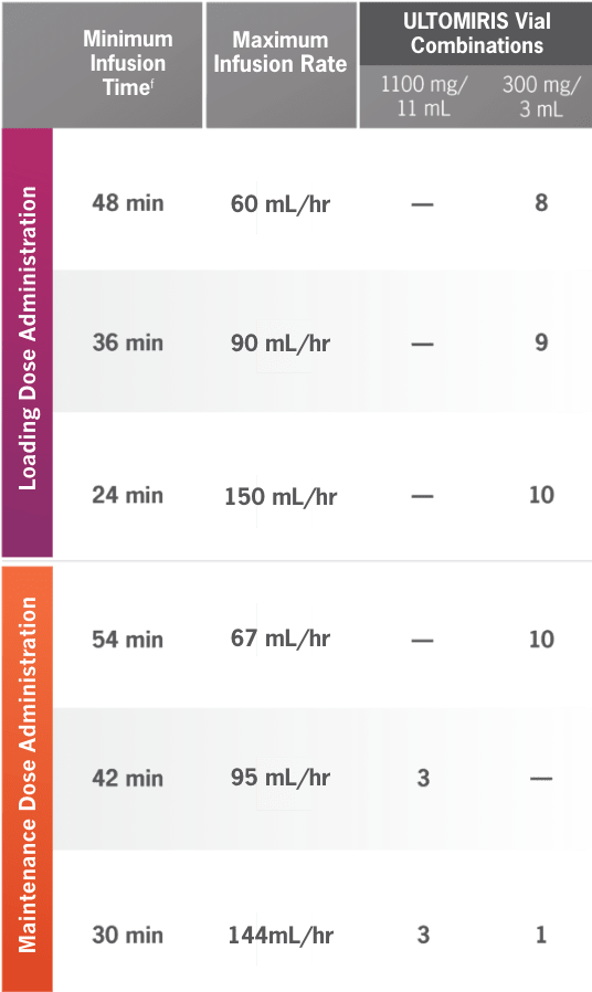 aMinimum infusion time for ULTOMIRIS 100 mg/mL maintenance doses ranges from 30 minutes to less than 1 hour, depending on body weight.1